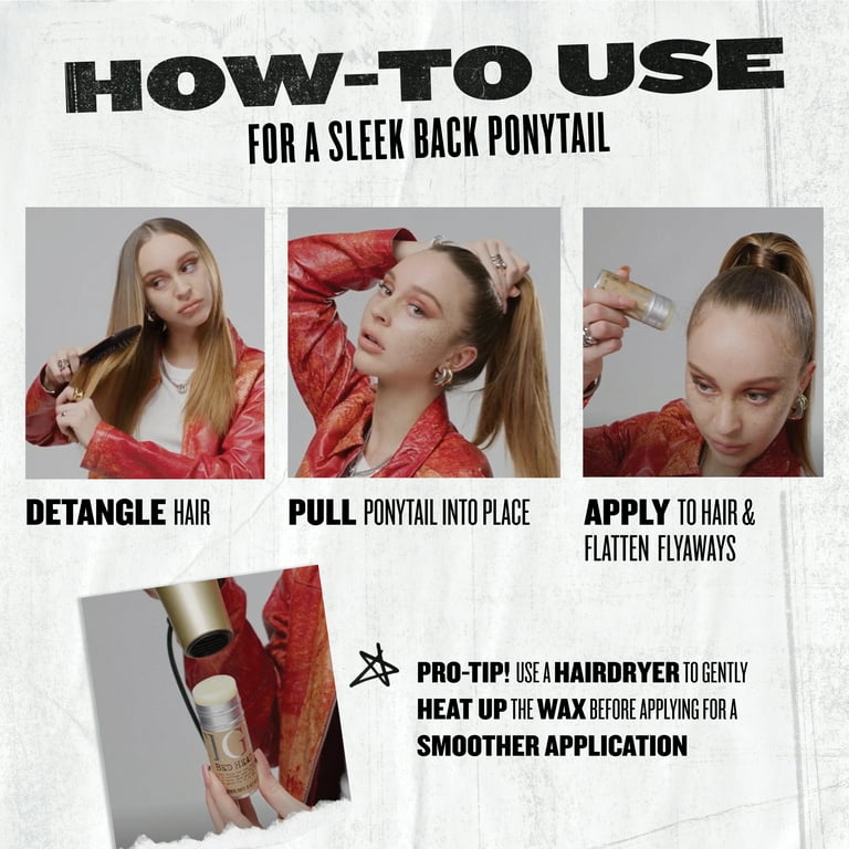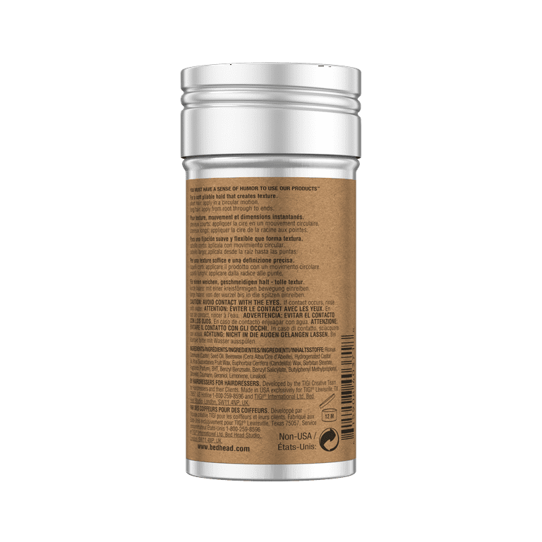 It’s the product that started it all for Bed Head! Formulated with beeswax and Japan wax, Bed Head's Hair Wax Stick creates instant texture and control and is also great for sleek buns and ponytails. With a hold level of 4/5, this hair styling product adds pliable hold with a semi-matte finish, giving you the control you need to keep your hair in check all day long. It’s perfect for all hair lengths and easy to work in and wash out, so you can create your favorite style with no mess. Our defining paste uses castor oil to condition hair, leaving it smooth and frizz free while leaving a fresh and aromatic fragrance with notes of lavender, coriander, warm cedar and white musk. How to use: For short hairstyles, apply directly to the hair in circles for a fun, ruffled texture. For ponytails, use it to push down flyaways and seal the hair down for a sleek wet look with great shine. To tackle flyaways, apply onto your fingers and push through the hair. For a separated, fun look, use your fingers to piece it through updos or braids. If needed, use a hairdryer to gently heat up the wax before applying for a smoother application.